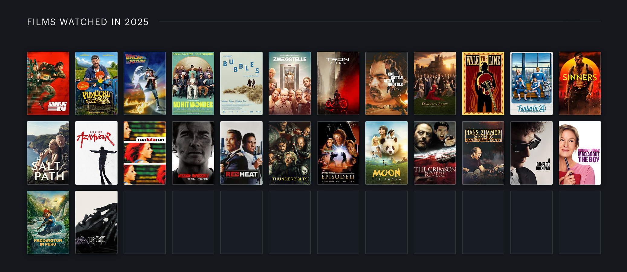 Stabil 26 Kinobesuche auch in diesem Jahr. Highlights waren das BFI IMAX London Waterloo und Sinners. Der sich den Spitzenplatz mit One Battle After Another teilt.